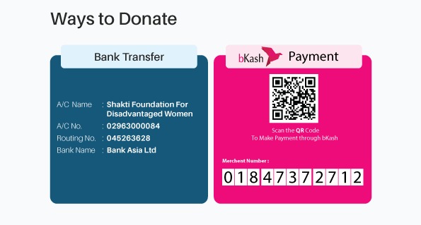 অর্থ প্রদানের মাধ্যম বিকাশ এর মাধ্যমে বিকাশ নম্বর: 01847 372 712 (Marchent Account) অথবা ভিজিট করুন : bKash Donate ব্যাংক ট্রান্সফার এর মাধ্যমে অ্যাকাউন্ট নাম: Shakti Foundation For Disadvantaged Women অ্যাকাউন্ট নম্বর: 02936000084 রাউটিং নম্বর: 070262986 ব্যাংকের নাম: Bank Asia Ltd ব্যাংকের ব্রাঞ্চ: Mirpur বিস্তারিত জানতে আমাদের ইমেইল করুন